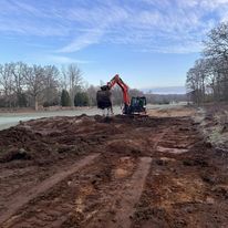 hjälp med att fördela ut massorna. De placeras huvudsakligen till vänster om fairway som blir ett område med kullar och svackor. Vi tänker oss också någon form av stensättning i dammens södra sida.